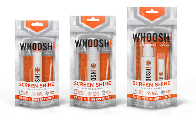 Mikrovláknová utěrka Whoosh! je tkaná z extra tenkého vlákna s antimikrobiální úpravou. Jemné smyčky W! tkaniny spolehlivě zachytí i mikroskopické nečistoty. V kombinaci s přípravky Screen Shine se Whoosh! postará o dokonalou hygienu vašeho mobilu, tabletu a dalších zařízení, kterých se denně dotýkáte. Podrobnější informace najdete zde.